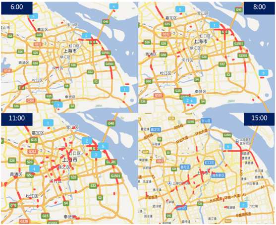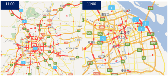 十一假期前,百度曾联合人民网推出《百度地图2016十一出行预测大数据报告》,预测十一期间的拥堵状况。报告中说,国庆首日10:30-11:00,全国各大一线城市都将迎来出城高速拥堵峰值。上海的状况完全印证了这一点,早6:00时区就已经出现了红色露点,11:00时,路网拥堵点达到最密、时速降到最慢。直到下午15:00后,出城高速的拥堵才明显缓解,转移为城区环路的部分拥堵。