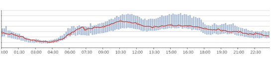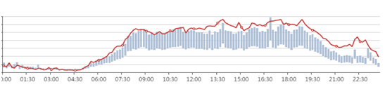 (注:途中灰色区域为平日正常时客流热度区间、红色曲线为9月30日客流热力值)