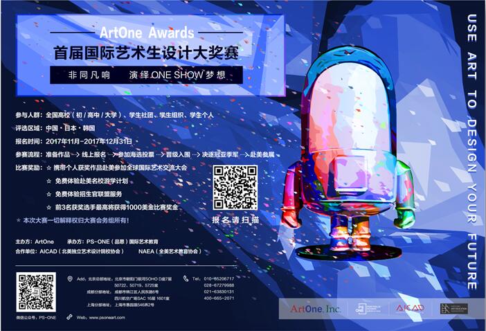 由北美独立艺术设计院校联盟(AICAD)和全美艺术教育协会(NAEA)以及中国赛区获得独家授权、并代表国内顶尖艺术教育水平的机构ArtOne和PS-ONE,联合推出“首届国际艺术生全球设计大赛”已于本月重磅登录中国,现已接受在线报名。