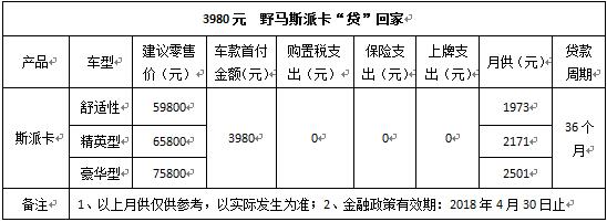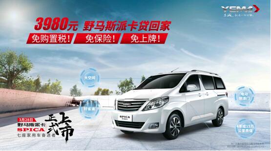 同时,为配合新车上市,野马汽车特别推出“3980元,野马斯派卡‘贷’回家—免购置税、免保险、免上牌”限时限量优惠活动,2018年3月28日-2018年4月30日期间,凡购买野马斯派卡客户均可享受支付3980元,野马汽车即可贷回家,还可额外获得超值大礼包。仅需一部手机的价格,即可轻松购车且月供超低,这样的优惠活动给广大消费者带来福音。