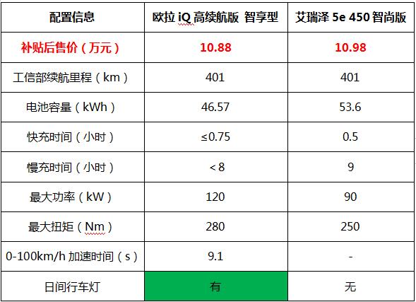 欧拉iQ搭载的是孚能三元锂离子动力电池和国际先进的博格华纳永磁同步电动机,最大功率达120千瓦,峰值扭矩280牛·米,拥有优秀的加速性能;而艾瑞泽5e的扭矩为250牛·米,相比而言,欧拉iQ拥有更强的爆发力,加速性更好,爬坡能力也更强。