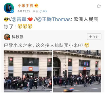 5小时后,也就是当天下午的13点15分,小米公司产品总监王腾转发了该博文并评论道:小米9太过优秀,欧洲人民震惊了!又过了11分钟,即13点26分,雷军加上“感动的红心”进行了转发,3分钟后,小米手机官微接力继续转发,并添加了一个头戴墨镜的“酷酷”表情,很显然,这个事情基本是真实的,而且,确实令小米方面十分振奋,毕竟,曾经国人就是这样争相排队去买iPhone的。