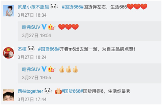 以哈弗M6为代表的在微博上发起的#中国最6 SUV# 蓝V联盟事件便是一次极为成功的尝试,在微博收获众多国人拥簇,一举挑起大众的爱国心及对国货的荣耀感。