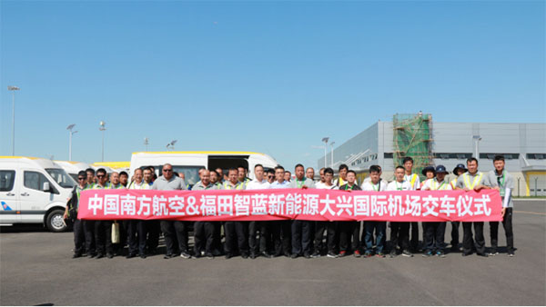 2019年8月29日,南方航空从福田智蓝新能源采购的纯电动机场内作业用车成功交付,正式投入大兴国际机场运营。据悉,南方航空采购这批车辆,均为新能源车辆,专项应用于大兴国际机场内部作业,为大兴国际机场绿色、高效运营提供保障,助力大兴机场成为世界一流的平安、绿色、智慧、人文的国际枢纽机场。